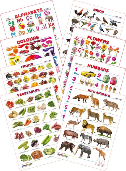 Spectrum Educational Mini Wall Chart Set Of 8 Set 1 English Alphabets Birds Colours Flowers Fruits